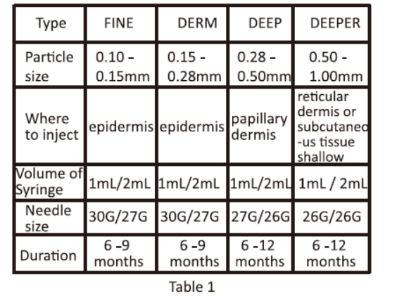 Singfiller® includes four specifications,FINE,DERM,DEEP,DEEPER, the information and differences of the four specifications are shown in Table 1.