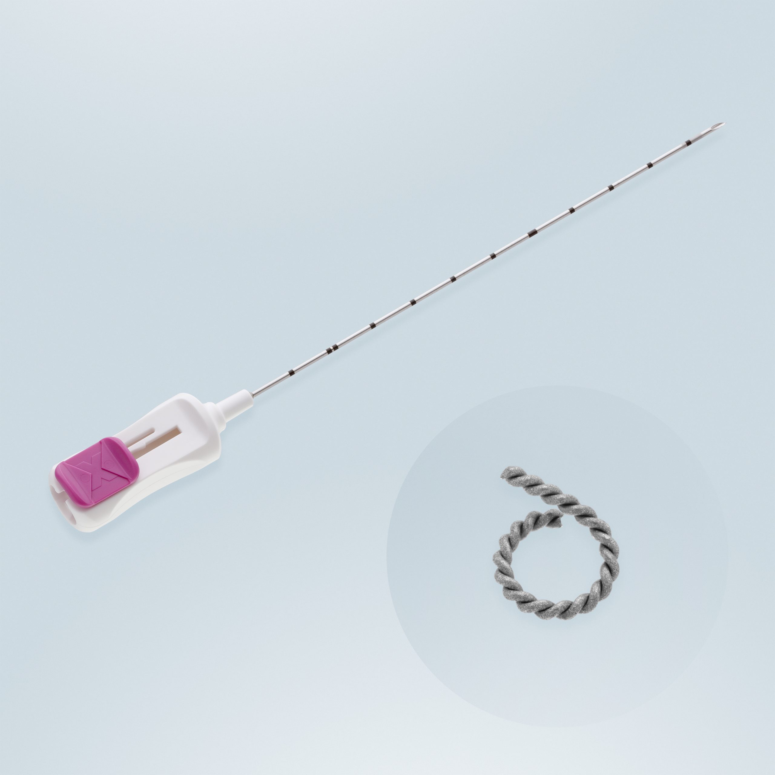 The markers are easily deployed single-handed with a low-profile 18G delivery device for minimal invasive and precise marking of breast lesion. Intelligent and differentiated three-dimensional shapes allow for ultrasound visibility from all transducer positions and provides tissue fixation.